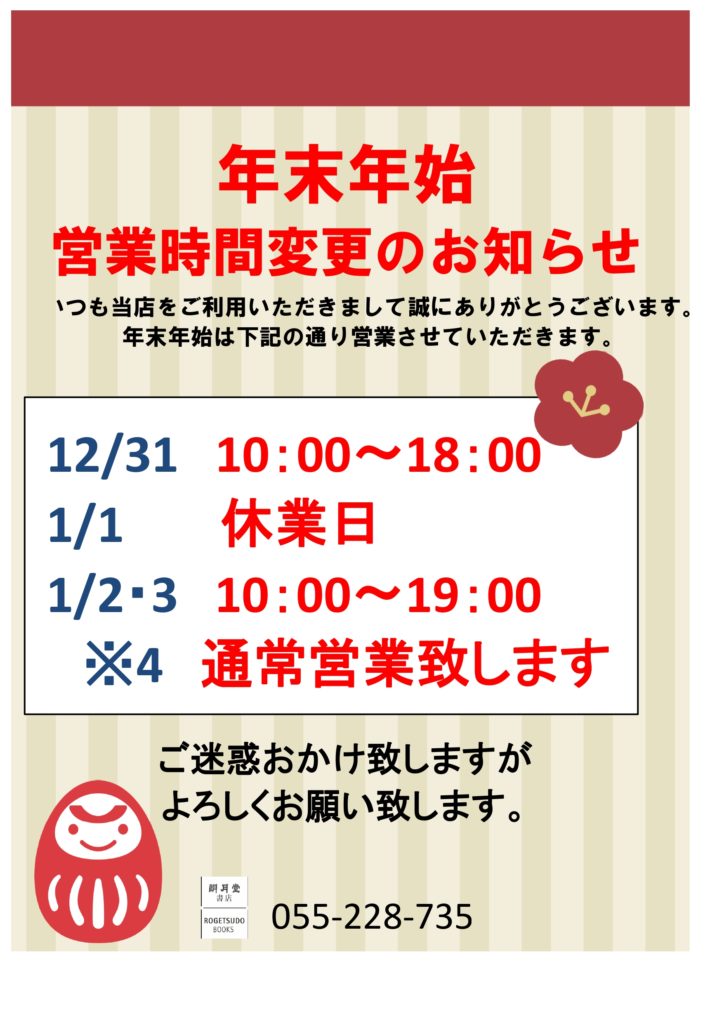 いつも当店をご利用いただき誠にありがとうございます。 年末年始は下記の通り営業させていただきます。 12月31日(水) 10:00-18:00 1月1日(木) 休業日 1月2日(金)・3日(土) 10:00-19:00 1月4日(日)~ 通常営業(10:00-21:00) ご迷惑をおかけ致しますが、よろしくお願い致します。